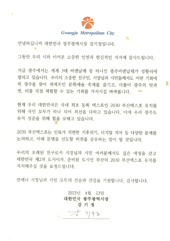 16일 강 시장은 지난 13일 제14회 광주비엔날레 파빌리온 프로젝트 참여 국가의 대사관과 문화원, 자매·우호 관계를 맺고 있는 14개국 23개 도시에 2030부산세계박람회 유치 지지를 요청하는 서한문을 발송했다.