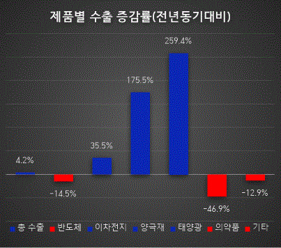 특히 이차전지 및 핵심소재, 태양광 모듈의 수출 비중이 전년 동기간 보다 16.4%p 증가한 32%를 차지하면서 수출 감소율이 큰 반도체 비중을 앞질러 수출 증가에 기여를 한 것으로 나타났다.