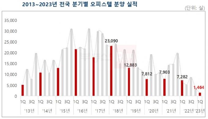 부동산 정보 업체 부동산R114가 분기별 오피스텔 분양 실적을 집계한 결과, 올해 1분기 분양 물량은 1464실로 지난해 1분기(약 7282실) 대비 약 80% 감소한 수준이다.