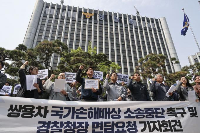 쌍용차 국가손해배상 소송중단 촉구 및 경찰청장 면담요청 기자회견이 17일 오전 서울 서대문구 경찰청 앞에서 열렸다. 기자회견 참석자들은 국가폭력 가해자 경찰청은 국가폭력 피해자들에게 사과하고, 피해회복 약속을 이행할 것을 촉구했다.