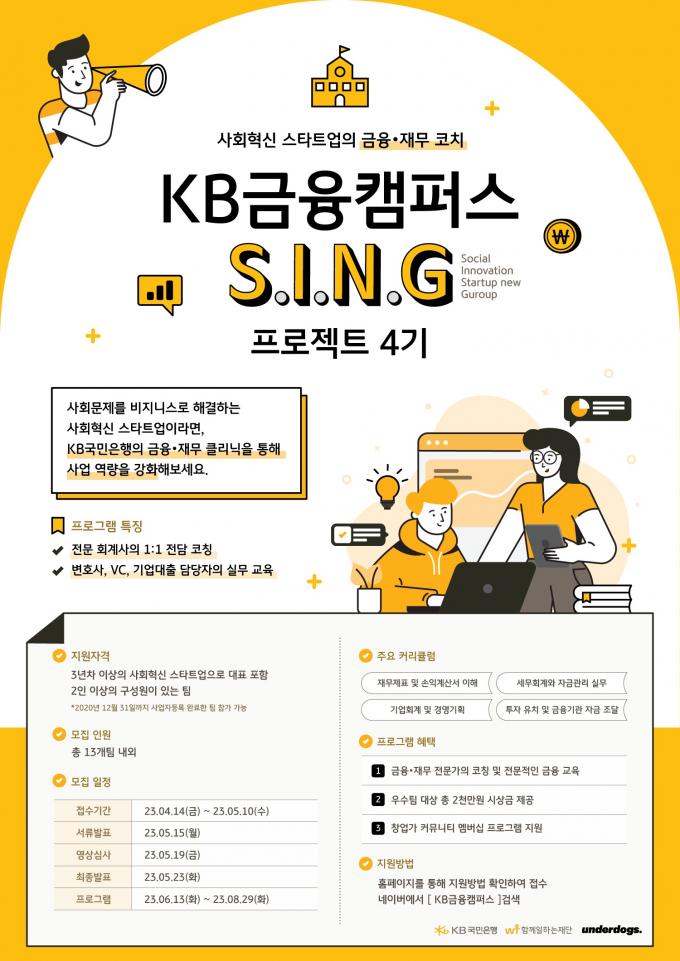 S.I.N.G. 프로젝트는 'Social Innovation startup New Guru'의 약자다. '국민은행과 사회혁신 기업이 함께 즐거운 노래가 절로 나오는 더 나은 세상 만들기'라는 의미를 담았다. 지난 3기 동안 사회혁신 스타트업 46개 기업의 재무 상태 개선 도우미 역할을 했다는 게 국민은행의 설명이다.