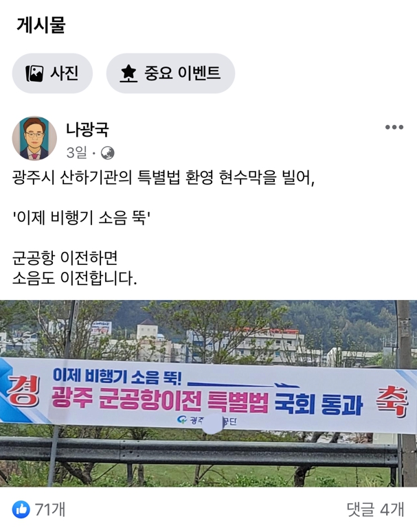 전라남도의회 나광국(무안2·더불어민주당) 전남도의원도 페이스 북에 현수막 사진을 게시한 뒤 "군 공항 이전하면 소음도 이전한다"고 꼬집었다.
