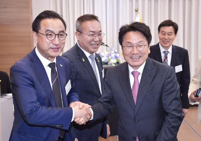 ▲18일 강기정 광주광역시장이 오전 동구 컬쳐호텔 람에서 열린 '대한민국시군자치구의회의장협의회 제248차 시도 대표회의'에 참석해 최봉환 의장협의회장 등과 인사를 나누고 있다. [광주광역시 제공]