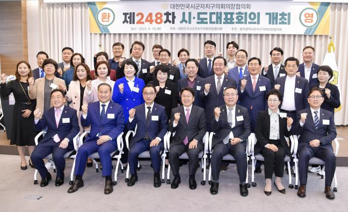▲18일 강기정 광주광역시장이 동구 컬쳐호텔 람에서 열린 '대한민국시군자치구의회의장협의회 제248차 시도 대표회의'에 참석해 각 시·도대표회장 등과 기념촬영을 하고 있다. [광주광역시 제공]