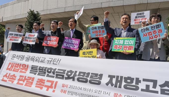 현재 대법원에는 양금덕, 김성주 할머니의 손해배상 채권과 관련해 압류한 미쓰비시중공업 상표권 2건, 특허권 2건에 대한 특별현금화명령 재항고 사건, 이춘식 할아버지 등 일본제철 소송 원고들의 손해배상 채권과 관련해 압류한 일본제철 소유 피엔알 주식 19만4794주에 대한 특별현금화명령 재항고 사건이 각각 계류돼 최종 판결만 남겨두고 있다.
