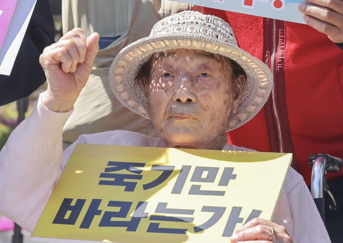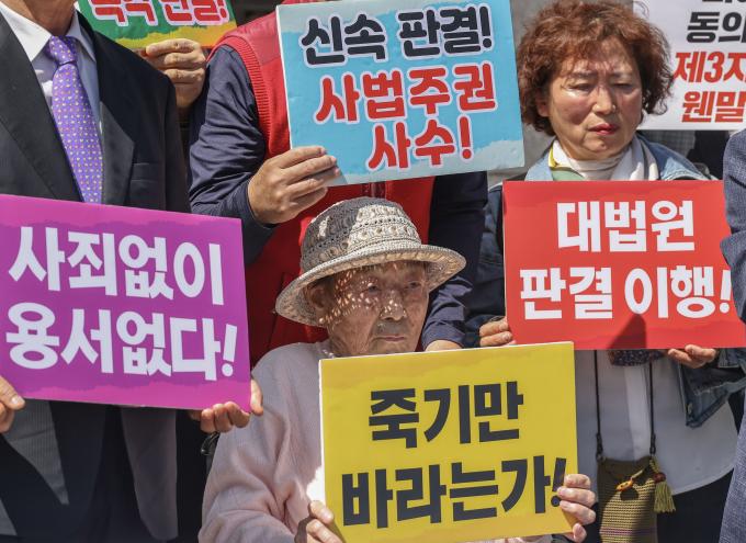 기자회견 참석자들은 강제동원 피해자에게 '판결금' 수령을 강요하는 윤석열 정부를 규탄하면서 "피해자의 뜻대로 조속한 권리실현을 위해 대법원은 하루 빨리 판결하라"고 요구했다.