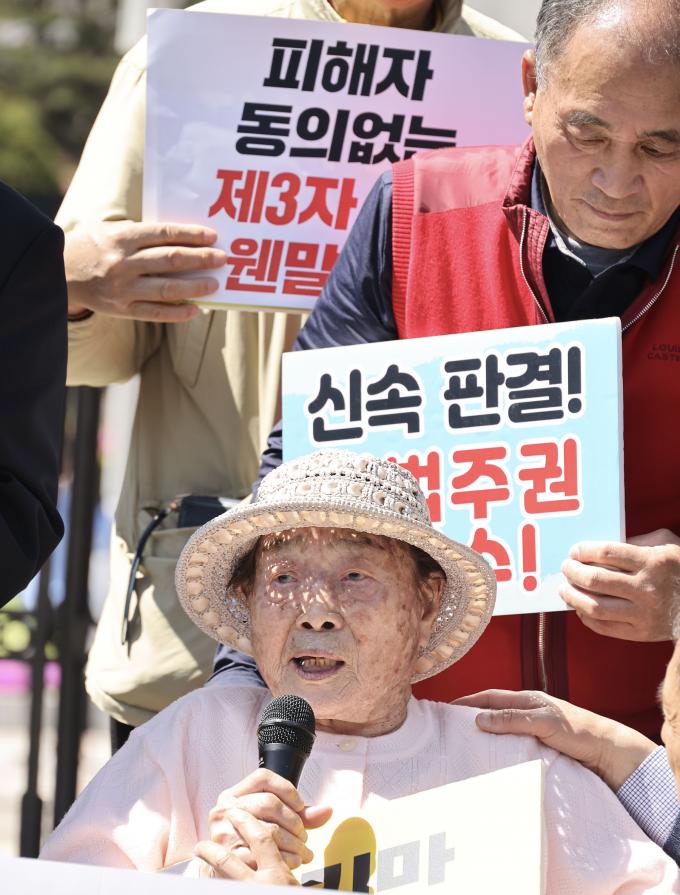 강제동원 피해 생존자 김성주 할머니와 대리인, 지원단체, 시민단체가 주최한 '대법원 특별현금화명령 재항고 사건 신속 판결 촉구 기자회견'이 19일 오전 서울 서초구 대법원 후문에서 열렸다.