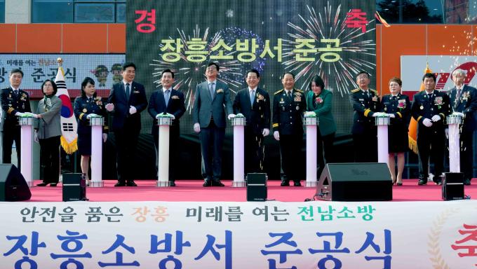 ▲20일 오후 장흥소방서 앞마당에서 열린 장흥소방서 신청사 준공식에서 김영록 전라남도지사, 김성 장흥군수 등 참석자들이 준공 선포식을 갖고 기념촬영을 하고 있다. [전남도 제공]