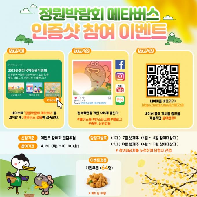참여자를 대상으로 두 차례의 랜덤추첨으로 모바일 치킨쿠폰 64장을 지급하며 당첨자발표와 상품 지급은 7월, 10월 넷째주에 실시한다. 이벤트에 대한 세부적인 내용은 정원박람회 메타버스 홍보관을 통해 확인할 수 있다.