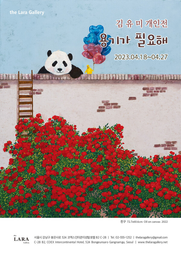 '용기가 필요해'전의 주요 주제는 시작을 위한 용기에 대한 이야기다. 김유미 작가 작품의 페르소나인 판다를 소재로 그린 작품들을 전시한다. 혼자 있기를 좋아한다는 판다의 특성에 영감을 얻었다는 김 작가는 혼자이기 싫은 현대인 모순된 감정을 캔버스에 그리기 시작했다.