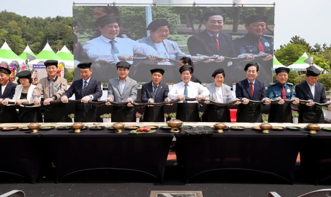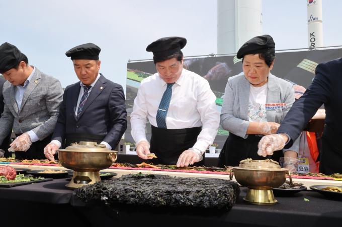 ▲21일 공영민 고흥군수와 김민열 고흥군의회 부의장 등 주요인사가 제13회 '고흥우주항공축제' 개막식에서 고흥 김 세계화를 위해 대형 김밥을 만드는 퍼포먼스를 하고 있다. [고흥군 제공]