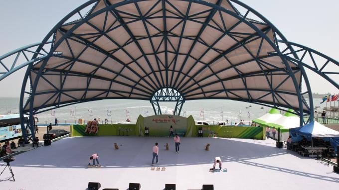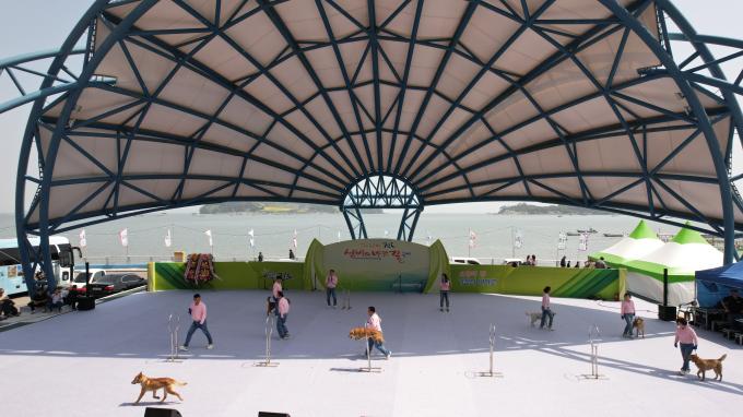 ▲▲21일 진도 신비의 바닷길 축제 현장에서 진도의 명물인 '진도개'들이 독(DOG) 스포츠를 선보이고 있다. [진도군 제공]