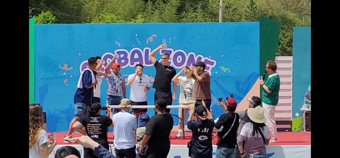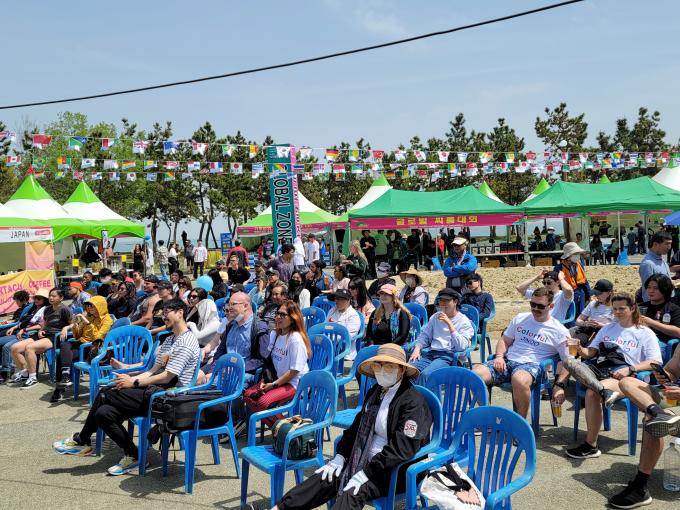 ▲22일 진도 신비의 바닷길 축제에서 외국인 관광객들을 대상으로 울금막걸리 마시기대회를 관중석에서 지켜보며 미소를 짓 있다. [진도군 제공]