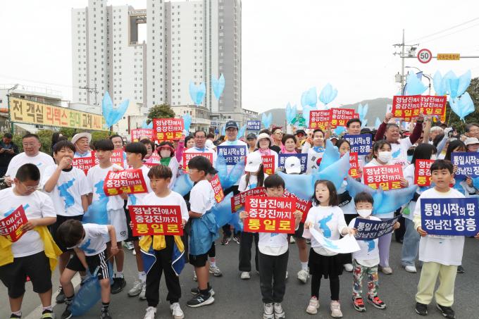 탐진강변에서 풍물놀이로 문을 연 행사는 정남진전망대로 자리를 옮겨 평화 비둘기 풍선 날리기, 박 터트리기 등 통일기원 행사로 이어졌다.