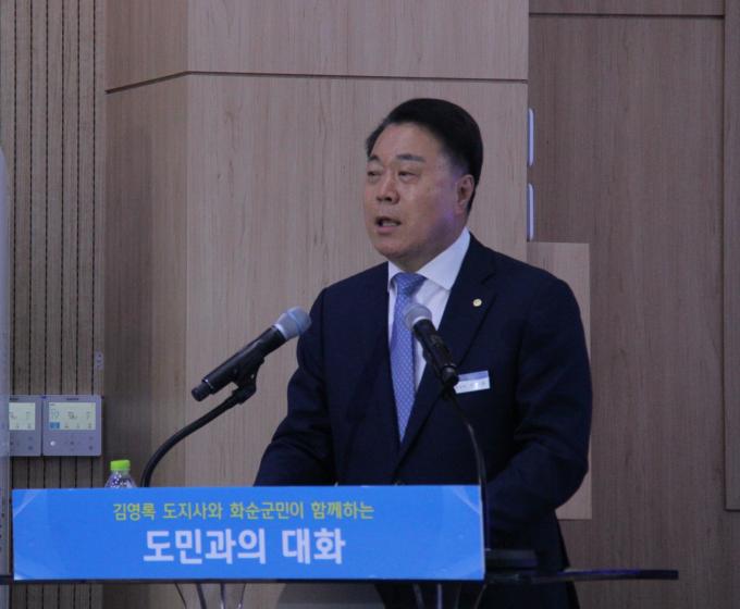 ▲26일 구복규 화순군수가 오전 화순군의회에서 열린 김영록 전남도지사와 화순군민이 함께하는 도민과의 대화에서 인사말을 하고 있다. [강성명 기자]