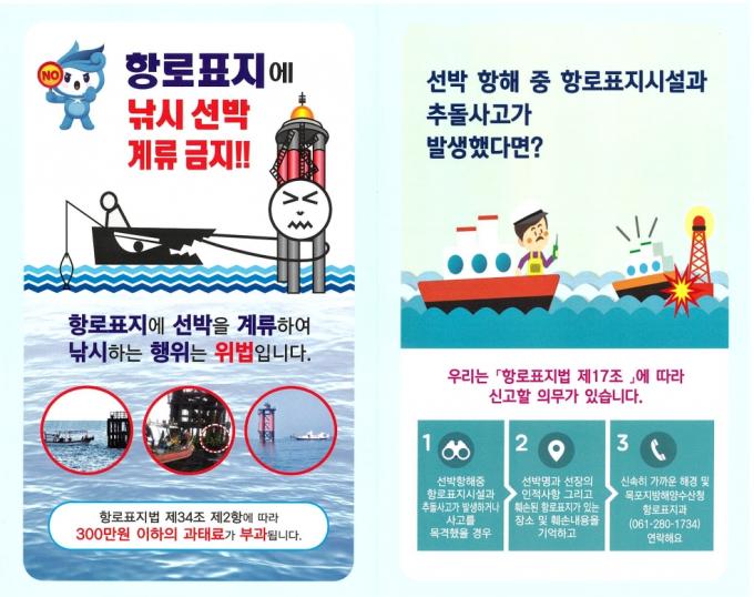목포해수청은 이번 캠페인 기간 동안 선박 운항 관련 기관과 단체 등을 방문해 항로표지 접촉사고 방지요령, 사고 발생 시 신고방법, 항로표지시설 선박 계류 금지 등이 수록된 안내자료를 배포하고 선박 종사자에게 안전운항을 당부할 예정이다.
