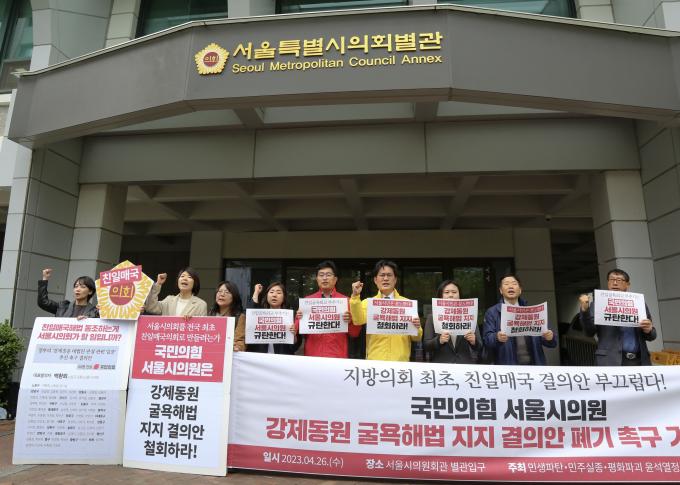 기자회견 참가자들은 "윤석열 정부의 굴욕적인 강제동원 해법과 친일매국적인 태도는 일본 정부를 더욱 기고만장하게 만들고 있다"며 "일본정부는 역사교과서 왜곡, 독도 영유권주장, '위안부' 합의이행 요구, 후쿠시마 수산물 수입 해제 요구 등 고압적인 태도로 한일관계 문제들에 대해 한국 보고 해결하라며 일방적으로 나오고 있다"고 주장했다. 더불어 대표발의자 박환희 의원은 지금이라도 당장 대표발의를 철회할 것을 요구했다.