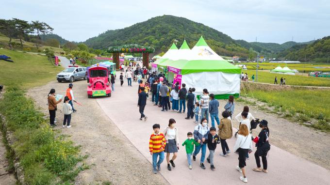 ▲오는 30일까지 열리는 2023 화순 고인돌축제 현장인 세계문화유산 고인돌 유적지에 관람객의 편의를 위해 '탐방열차'가 1000원에 운영되고 있다. [화순군 제공]