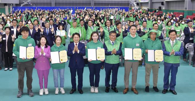 ▲26일 강기정 광주광역시장이 오전 북구종합체육관에서 열린 '제13회 새마을의 날 기념식'에 참석해 유공자 표창을 한 뒤 기념촬영을 하고 있다. [광주광역시 제공]