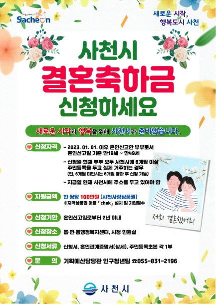 지원 대상은 올해 1월 1일 이후 혼인신고한 부부로서, 부부 모두 6개월이상 사천시에 주민등록을 두고 실제 거주해야 한다. 단, 6개월 미만 거주자는 6개월이 경과하면 신청이 가능하다.