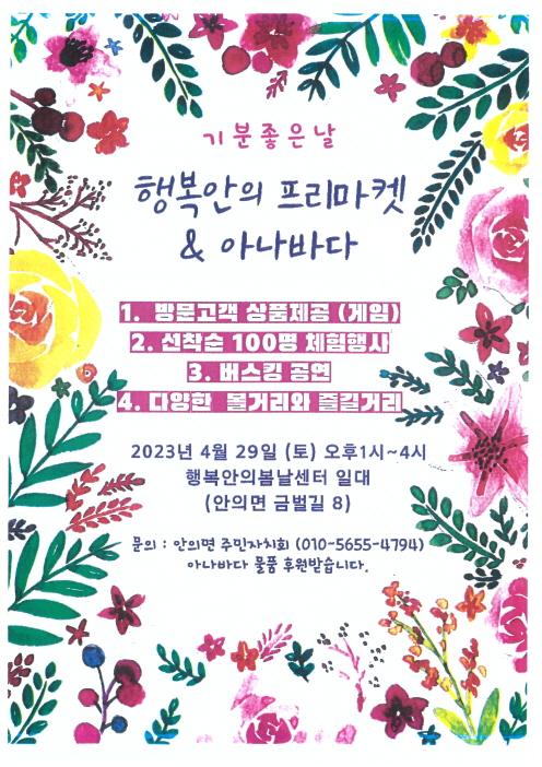 이날 행사에는 총 15여 팀이 참여해 핸드메이드 잡화품, 인도 물품, 먹거리 등 프리마켓을 마련한다. 안의면민들이 자발적으로 기부한 물품들을 모아 이날 행사에 자율후원금을 받는 아나바다 행사다.