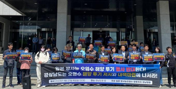 환경단체 중심으로 구성된 경남행동은 이날 "환경적 문제와 국민 먹거리 건강 위협 문제는 물론 주권국가로서 후쿠시마 오염수 해양투기 문제는 심각한 상황"이라며 경남도에 방사능 오염수 방류에 반대한다는 입장 표명을 요구했다.