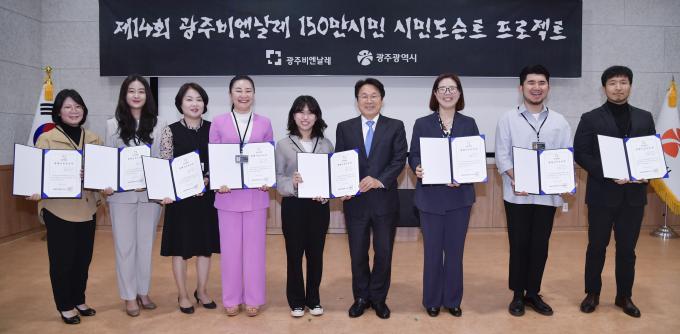 ▲강기정 광주광역시장이 27일 오전 광주비엔날레 찾아오는 교육 과정 수료자에게 명예시민도슨트증을 전달한 뒤 기념촬영을 하고 있다. [광주광역시 제공]