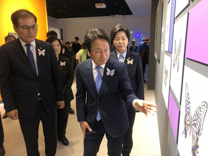 ▲ 28일 강기정 광주광역시장이 이상익 함평군수에게 '나비곤충표본 체험 전시관'에 전시된 나비 모양의 그림을 보고 "신기하다"며 손짓하고 있다. [강성명 기자]