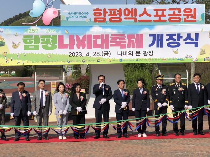 ▲28일 이상익 함평군수가 제25회 함평나비대축제 개장식에 참석해 테이프 컷팅식에 앞서 인사말을 하고 있다. [강성명 기자]