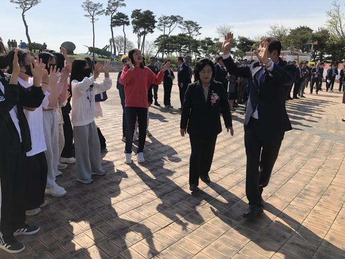 ▲28일 이상익 함평군수가 제25회 함평나비대축제 개장식을 마친 뒤 지역 학생들에게 인사하고 환호를 받고 있다. [강성명 기자]
