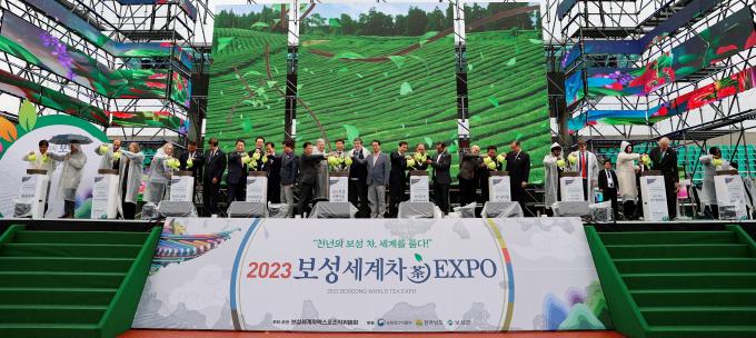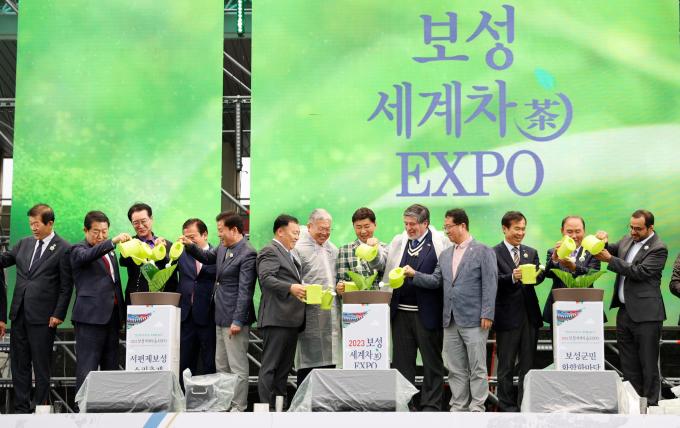 ▲29일 김철우 보성군수와 박주선 전 국회부의장·박우량 신안군수 등 내·외빈 인사들이 공설운동장에서 열린 2023보성세계차엑스포 개막식에서 '녹차 새싹'에 물을 주는 퍼포먼스를 하고 있다. [보성군 제공]