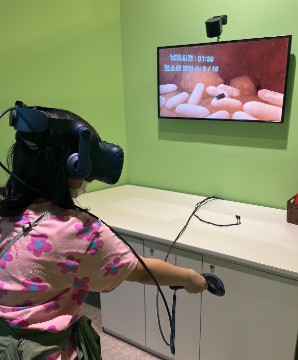 ▲30일 개막 3일째를 맞는 '2023 함평나비대축제' 현장에 초등학생 관람객이 개미와 게임을 하는 가상현실(VR) 체험을 하고 있다. [강성명 기자]
