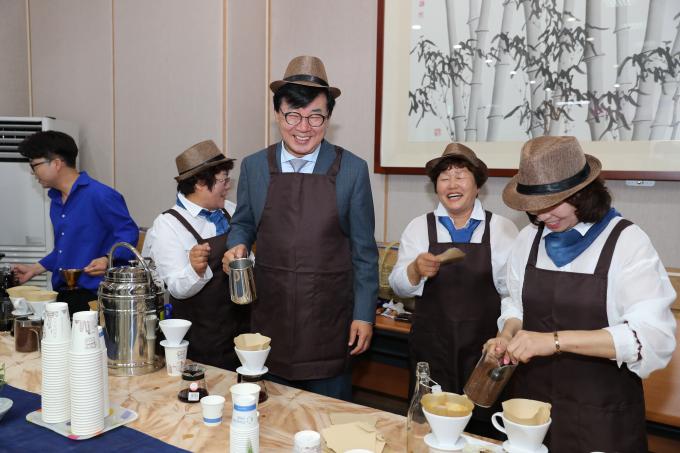 이번 정례조회는 종합사회복지관 전문 바리스타를 초청하고 조회에 참석한 직원에게 김성 장흥군수가 직접 커피를 갈며 봉사하는 모습을 보여 박수를 받았다.
