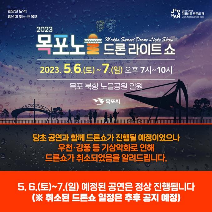 목포시는 당초 5~6일 개최 예정이었던 '2023 목포노을 드론라이트쇼'를 기상 악화 예보에 따라 6~7일로 옮겼다.