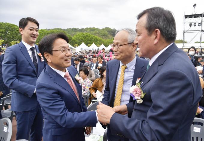 ▲3일 강기정 광주광역시장이 오후 전남 담양군 추성경기장에서 열린 '2023 담양 대나무축제' 뉴 뱀부 페스티벌에 참석해 이병노 담양군수와 인사를 나누고 있다. [광주광역시 제공]