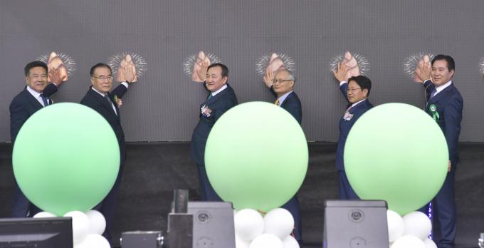 ▲3일 강기정 광주광역시장이 오후 전남 담양군 추성경기장에서 열린 '2023 담양 대나무축제' 뉴 뱀부 페스티벌에 참석해 이병노 담양군수, 이개호 국회의원 등 내빈들과 개막 퍼포먼스를 하고 있다. [광주광역시 제공]