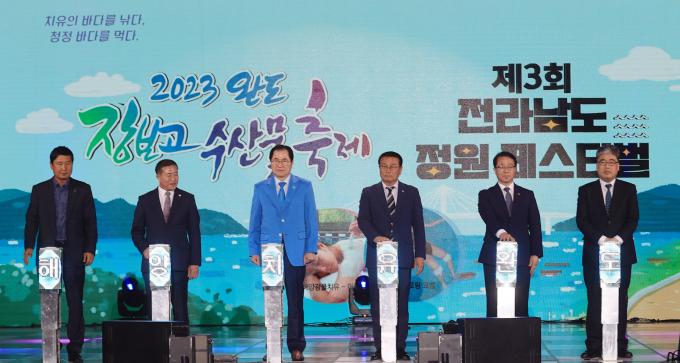 ▲제3회 전라남도 정원 페스티벌 개막식이 4일 오후 완도 청해진스포츠센터에서 열린 가운데 신우철 완도군수, 문금주 전남도 행정부지사, 임상섭 산림청 차장 등 내빈들이 개막을 알리는 퍼포먼스를 하고 있다. [전남도 제공]