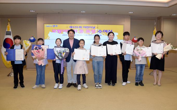 ▲5일 강기정 광주광역시장이 오전 비즈니스룸에서 열린 제101회 어린이날 행사에 참석해 모범어린이에게 표창을 수여한 후 기념촬영을 하고 있다. [광주광역시 제공]