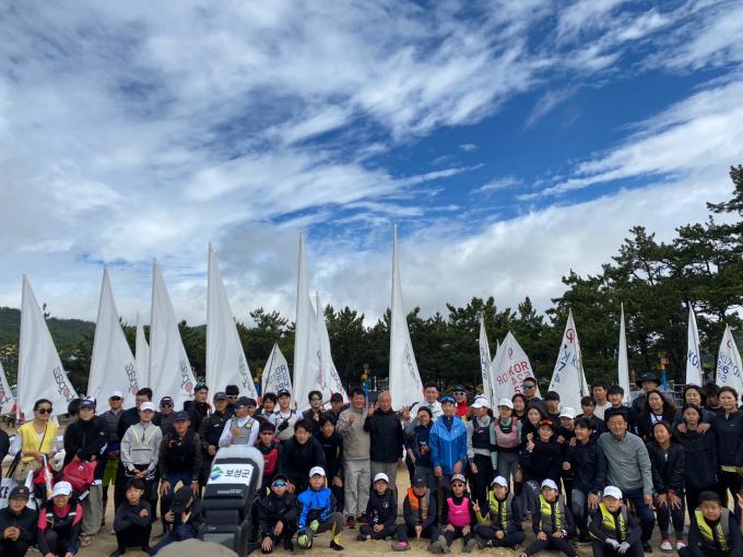 ▲6일 보성군 율포솔밭해수욕장에서 6일 김철우 보성군수와 한국옵티미스트 전국 요트대회 참가자들이 기념 촬영을 하고 있다. [보성군 제공]