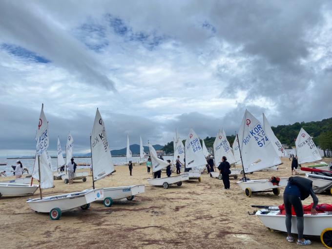 ▲6일 보성군 율포솔밭해수욕장에서 '2023 한국옵티미스트 전국 요트대회'에 참가한 요트 선수들이 경기를 준비하고 있다. [보성군 제공]