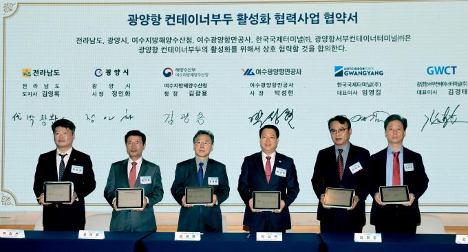 ▲10일 광양항 컨테이너부두 활성화 대토론회가 광양 YGPA 국제회의장에서 열린 가운데 박창환 전남도 정무부지사, 정인화 광양시장, 김강용 여수지방해양수산청장, 박성현 YGPA 사장, 임영길 한국 국제터미널(주) 대표, 김경태 광양항 서부컨테이너터미널㈜ 대표가 컨부두 지원사업 협약 체결식을 갖고 있다. [전남도 제공]