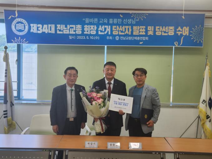 전남교원단체총연합회 선거관리위원회는 회장 선거에 단독 입후보한 권 교장을 심의를 거쳐 지난 10일 당선증을 교부했다.