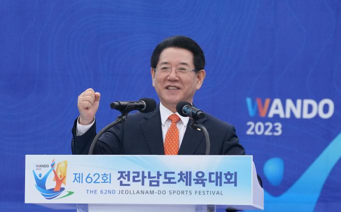▲김영록 전남지사가 12일 완도종합운동장에서 열린 제62회 전라남도 체육대회 개회식에서 기념사를 하고 있다. [전남도 제공]