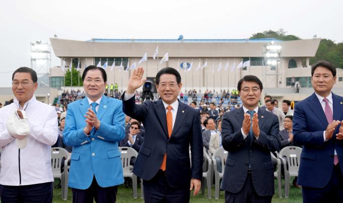 ▲김영록 전남지사가 12일 완도종합운동장에서 열린 제62회 전라남도 체육대회에서 신우철(왼쪽 두번째) 완도군수와 선수단을 환영하고 있다. (전남도 제공]