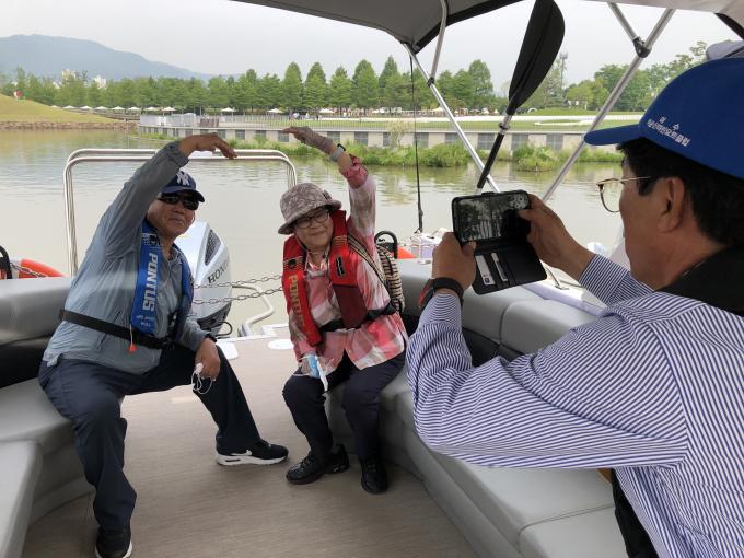 ▲15일 오전 순천만국제정원박람회장 '정원드림호'에서 부부 관람객이 12인승 정원드림호를 탑승해 추억을 남기기 위한 사진촬영을 하고 있다. [강성명 기자]