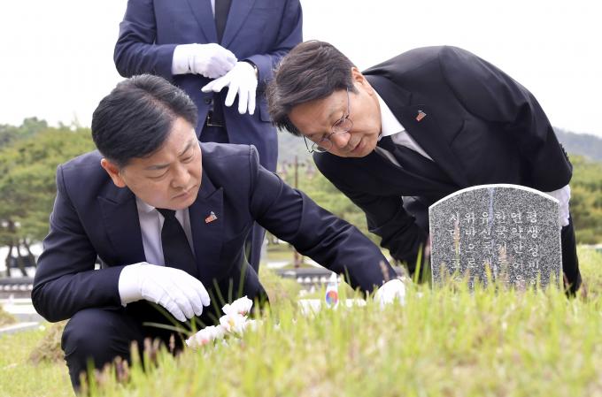▲강기정 광주광역시장과 김관영 전북도지사가 15일 오전 북구 운정동 국립 5·18민주묘지를 찾아 참배하고 묘역을 살펴보고 있다. [광주광역시 제공]