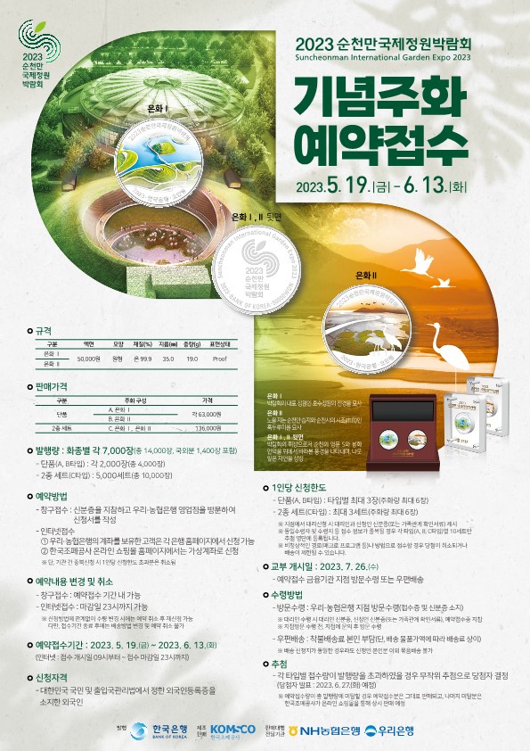 16일 박람회조직위에 따르면 기념주화는 박람회의 대표 정원인 호수정원의 전경을 묘사한 A타입과 노을 지는 순천만 습지와 순천시 시조인 흑두루미를 묘사한 B타입 등 두자리 종류의 은화다.