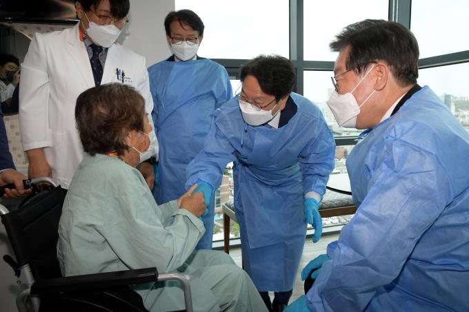 ▲18일 강기정 광주광역시장이 오후 더불어민주당 이재명 당대표와 광주의 한 병원에 입원중인 일제강제동원 피해자 양금덕 할머니를 위문하고 있다. [광주광역시 제공]