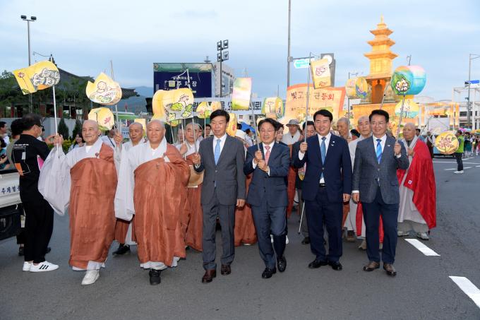 ▲강기정 광주광역시장이 20일 오후 5.18민주광장에서 열린 불기2567년 부처님오신날 봉축행사인 2023년 빛고을관등회 관등법회에 참석하여 참석자들과 함께 연등행진을 하고 있다. [광주광역시 제공]