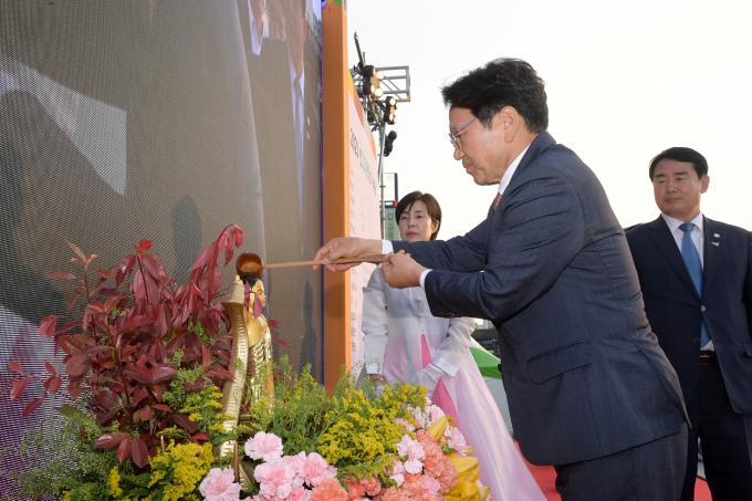 ▲강기정 광주광역시장이 20일 오후 5.18민주광장에서 열린 불기2567년 부처님오신날 봉축행사인 2023년 빛고을관등회 관등법회에 참석하여 탄생불에 물을 부어 씻기는 관불을 하고 있다. [광주광역시 제공]